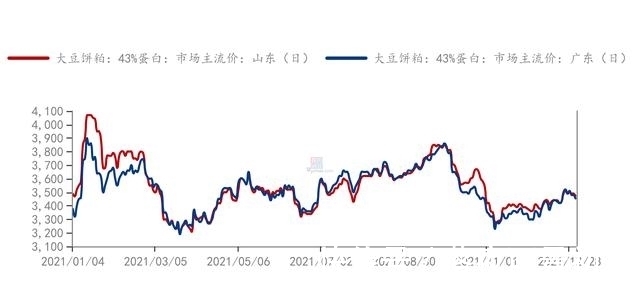 具体来看,2021年广东饲料总产量涨幅较大,除了下游终端需求给力之外,同样豆粕价格全年较低,给当地的饲料企业加大了饲料利润,有足够大成本投入生产从而加大饲料市场扩张。2021全年广东市场43%豆粕均价3518.08元/吨比山东3544.28元/吨便宜26.2元/吨。饲料蛋白原料价格相对低,给终端市场降低了养殖成本,增大投入了积极性。