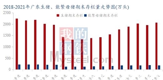 2021年广东豆粕全年供应量约890万吨,外流豆粕量较2020年减少10%,省内自用量加大。据广东省统计局统计,2021年年末广东省生猪存栏量为2075.5万头,同比增加308.2万头,能繁母猪存栏为191.2万头,达到农业农村部划定的正常保有量的100.6%。在高利润背景下,一季度猪企仍保持产能扩张势头,大量增加后备种猪,三季度新增种猪陆续进行配种,致三季度末能繁母猪存栏量环比增加8.3万头。第四季度能繁母猪持续淘汰落后产能,优化存栏结构,存栏量环比下降2.7%,同比增长3.5%。年末能繁母猪存栏为191.2万头,达到农业农村部划定的正常保有量的100.6%,生猪存栏量同比增长17.44%,为广东省内的豆粕消费量奠定了坚实的基础。